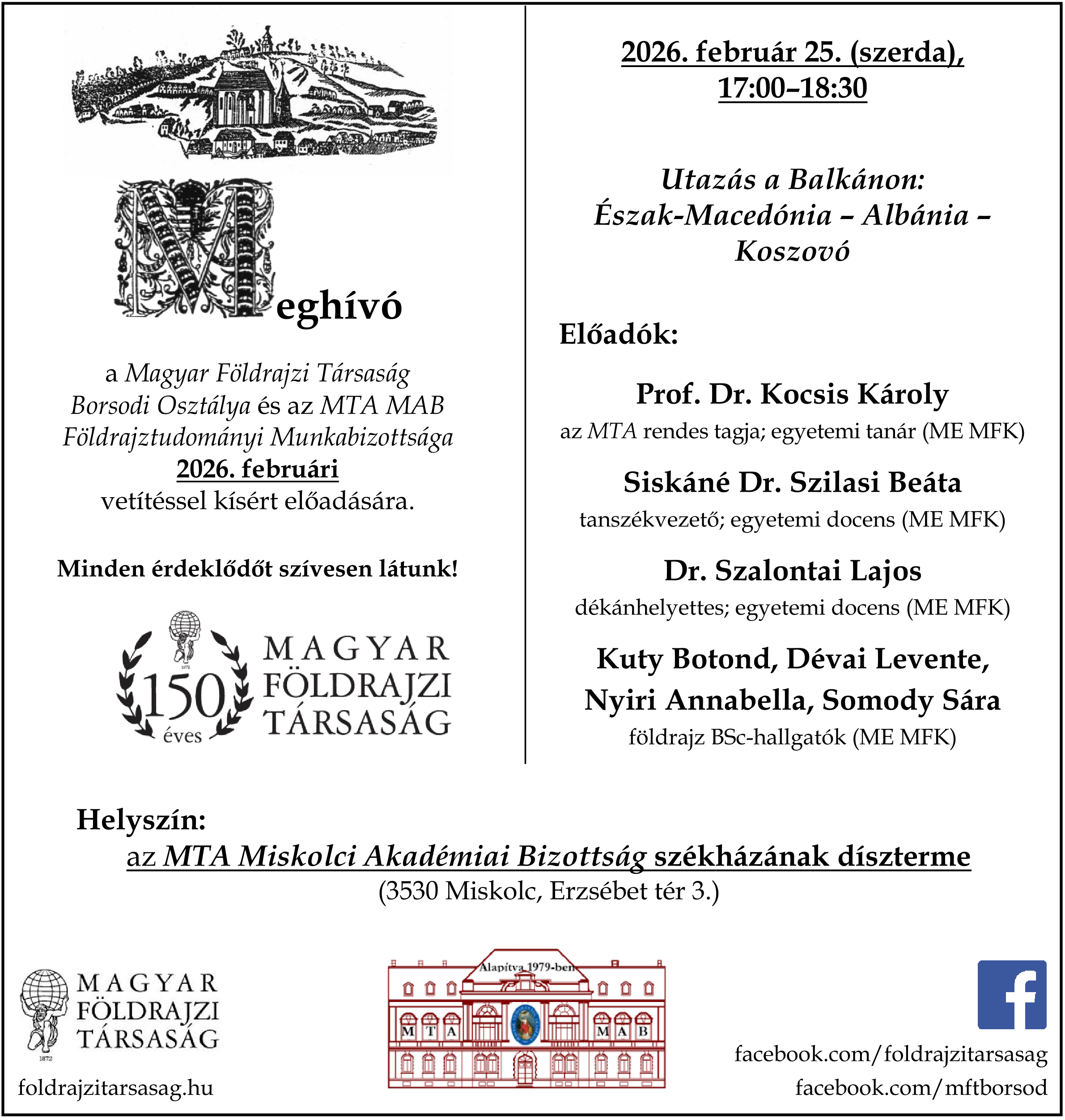 A Magyar Földrajzi Társaság Borsodi Osztálya és az MTA MAB Földrajztudományi Munkabizottsága minden érdeklődőt szeretettel vár a 2026. februári vetítéssel kísért előadására.